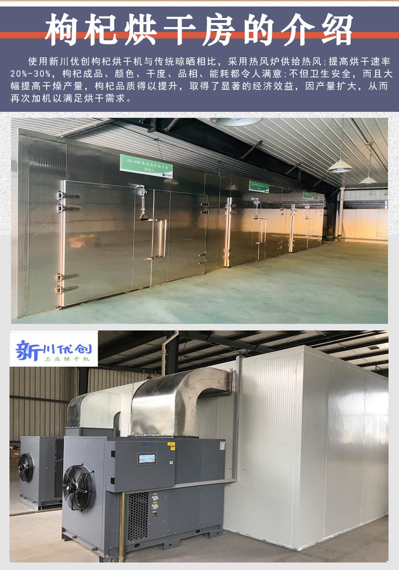 枸杞鮮果保質期極短,一般只有2~3天左右,所以在深加工時遇到的首要問題就是脫水保質的問題。目前,我國寧夏枸杞種植面積達50余萬畝,而寧夏地區(qū)枸杞脫水加工儲藏技術落后,90%以上枸杞采用自然攤曬法曬干加工,由于天氣等原因每年損失約300元/畝,如遇到連天陰雨每畝損失超過千元,為此現(xiàn)代化的枸杞烘干設備應運而生。