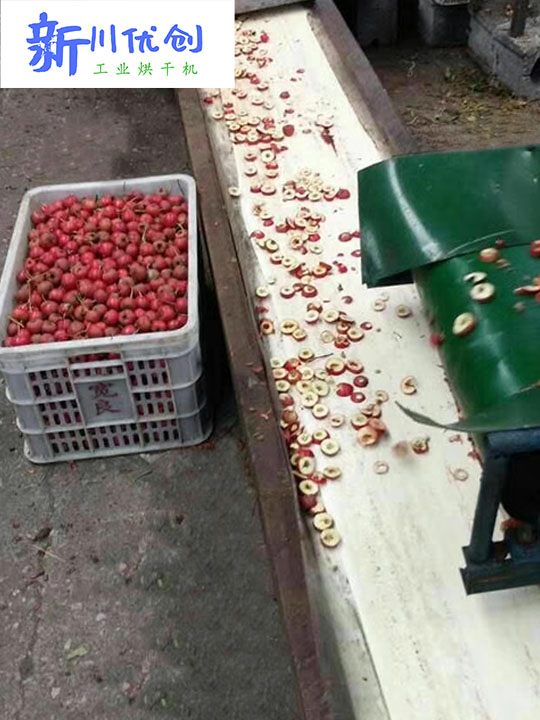 1、首先將山楂洗凈切片,厚度約2CM,采用切片機完成,這樣可以有效的保證山楂片厚度均勻,在烘干的過程中也能夠受熱均勻,利于循環(huán)除濕。