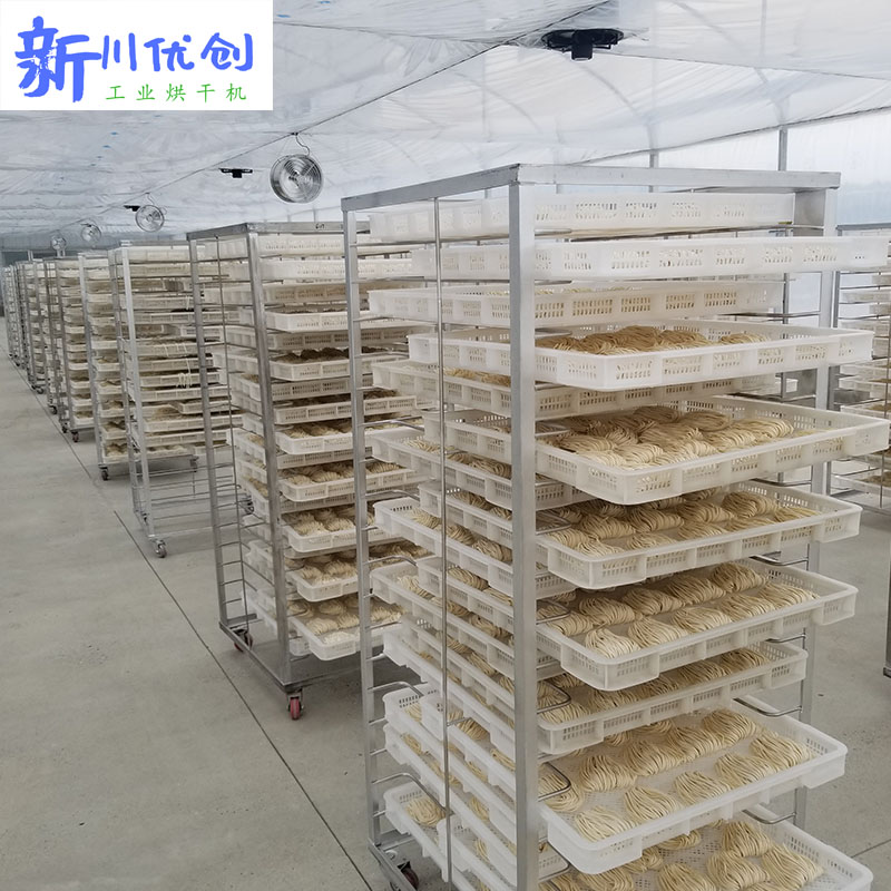 面條,米粉類(lèi)物料有一個(gè)共通性:外形細(xì)長(zhǎng)、質(zhì)輕,且需保持一定的直線度;因此,面條類(lèi)物料不能采用常規(guī)的由下而上的方式,也不能采用吹的方式,只能采用由上而下的烘干方式。最常見(jiàn)的是將熱源布置于烘房頂部,通過(guò)上置風(fēng)機(jī)的方式使房間內(nèi)空氣由上而下流動(dòng),過(guò)程中接觸物料,帶動(dòng)物料升溫,同時(shí)帶走物料水分,沿底部排濕通道排出外。